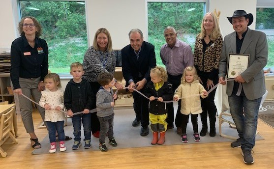 Official Ribbon Cutting back row L-R, Michelle Knott ED Kids & Us, Melissa McEwan Superintendent with BWDSB, MPP Rick Byers, Grey County Warden Selwyn Hicks, Director of Community Services Anne Marie Shaw, and Kids & Us Board President Dane Nielsen. Front Row – Durham Kids & Us clients.