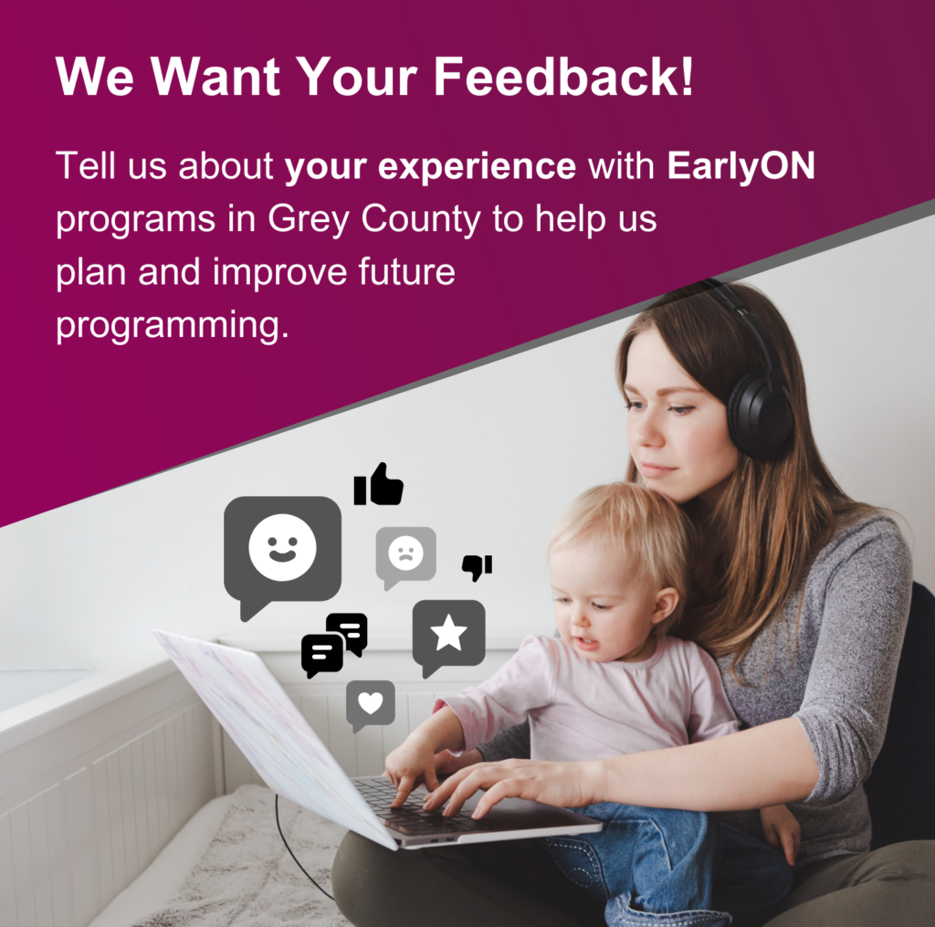 We Want Your Feedback! Tell us about your experience with EarlyON programs in Grey County to help us plan and improve future programming. We want to hear it all… what you love, what you would like to see changed, and everything in-between. Click the link to complete the Grey County EarlyON Program: Parent and Caregiver Survey.
